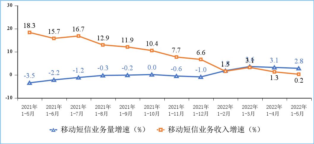 今年前5个月,移动电话去话通话时长完成9278亿分钟,同比增长0.8%;固定电话主叫通话时长完成337.1亿分钟,同比下降13%。1-5月份,全国移动短信业务量同比增长2.8%;移动短信业务收入同比增长0.2%,增速较1-4月份分别回落0.3个和1.1个百分点。